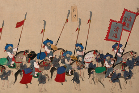 TsushimaTwo Emaki (picture scrolls) about the Joseon missions from Korea remain in Tsushima. They depict the Tsushima Clan leading and guarding a procession of the mission envoys. After Japan-Joseon interaction had been cut off due to Toyotomi Hideyoshi’s invasion of Korea, the Tsushima Domain worked hard to reinstate that interaction, and from 1607 to 1811, welcomed a total of 12 missions from Joseon to Tsushima. One of these Emaki scrolls was produced in the 17th-18th century, and the other in the 19th century. In 2015, they were designated as Important Cultural Properties of Japan as “Records of Tsushima’s So Clan.” Even amid the heightened atmosphere of this kind of procession, the scrolls also depict people tying the laces of their straw sandals and dogs barking, giving a tranquil, genial air to the scene.