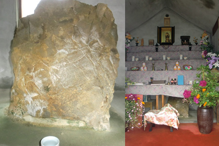 Shin-KamigotoNakadori Island has several sites that are associated with the Japanese diplomatic missions to Tang China (photograph: Hime Shrine). Around the inlet called Mikanoura (three-day inlet), so named because the missions’ ships would stop there for three days, there are Kinpose, a cape where it is believed the missions’ ships had their sails repaired, and Mifune-sama, a ship-shaped stone to which the envoys are said to have prayed for the safety of their voyages. Also, around the areas now known as Aiko and Aokata, which are referenced in the Hizen-no-Kuni Fudoki (Chronicles of Hizen Province) as harbors where the missions’ ships waited for the wind, there are the ruins of Hime Shrine, where the envoys are said to have prayed for safety on their voyage, and the Tomojiri Stone, where the mission ships are said to have moored.