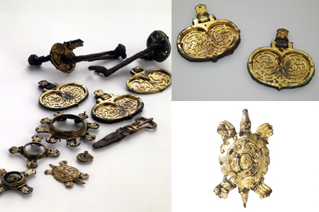 The ancient burial mound, Sasazuka Tumulus, is a two-level structure, with the burial mound built on top of a base level. The base is 70 meters in diameter and 3 meters high, while the mound section is 40 meters in diameter and 10 meters high. Many gilt bronze saddlery items have been excavated from Sasazuka Tumulus, including a tortoise-shaped horse brass, gyoyo saddle decorations, uzu crupper ornament, and tsuji-kanagu belt clasps. Besides the saddlery items, Silla earthenware was also discovered in the tomb, informing us of its connections with the Korean peninsula. 162 of the excavated items have been designated as Important Cultural Properties of Japan.