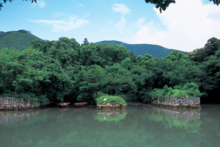 TsushimaA dry dock built by the Tsushima Domain in 1663, in a man-made cove built into Kutaura Inlet, south of Izuhara Harbor. In the Edo period, trading ships that had cross the seas in all directions would call into this dry dock for repairs. Kaito Shokoku Ki, a book from the Joseon era published in 1471, contains a reference to “shipbuilding in Kutaura,” which suggests that the area already functioned as a dry dock before the Tsushima Clan’s Ofuna-e was built. There is no other extant example anywhere in Japan of a dock of such a large scale and so closely resembling its original form. This makes the Tsushima Clan Ofuna-e Ruins a very valuable remnant of the Edo Period.