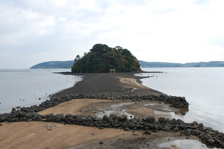 나카도리지마 섬에 위치한 견당사 관련 사적(사진은 ‘히메 신사’). 견당사 선박이 3일간 체류한 것에 유래하는 지명 ‘미카노우라’ 주변에는 견당사 선박의 돛을 수리했다고 여겨지는 ‘긴포세’, 견당사가 안전한 항해를 기원했다고 하는 ‘미후네사마’가 있습니다. 또한, 견당사 선박이 순풍을 기다리는 항구로서 『히젠국 풍토기』에도 등장하는 현재의 아이코와 아오카타 주변에는, 견당사가 안전한 항해를 기원했다고 전해지는 ‘히메 신사터’, 견당사 선박의 뱃줄을 매어두었다고 전해지는 ‘도모지리이시 바위’가 있습니다.