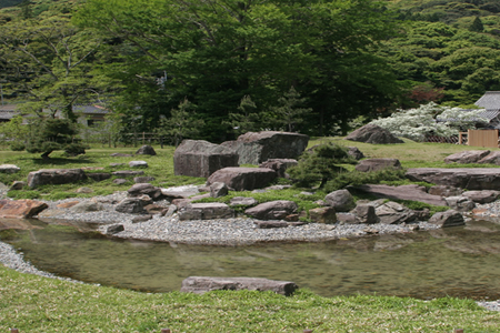 對馬市17世紀末的江戶時代,在對馬藩主宗家的居城——金石城內建造的庭園。宗家文書《毎日記》中,可以看見自1690至1693年間,曾在「御城」打造「心字池」的紀錄。戰後,這座庭園幾乎被掩埋,不過在獲指定為史蹟名勝的契機下,於1997年至2004年進行發掘調查,復原了昔日的模樣。對馬藩在此迎接朝鮮通信使,對著映照在水面上的月亮祈願日朝友好關係永存,環繞著庭園,加深彼此之間的感情。
